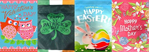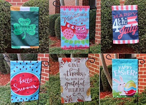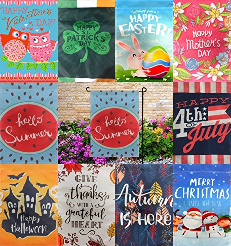 -. Feature : GARDEN FLAG HOLIDAY SET: 10 beautiful 12 x 18 inch garden flags for every season. This garden flag set features an assortment of flags. Fly your 12 x 18 flag banner proudly for every holiday season. / DOUBLE SIDED DESIGN: All ten flags are P.R.Inted on both sides. The set includes a Valentines day flag, St. Patricks day flag, Easter garden flag, Mothers Day Garden Flag, Summer Garden Flag, 4th of July flag, Halloween garden flag, Fall Garden Flag, Thanksgiving garden flag, & Christmas garden flag / PERFECT GIFT: If you are looking for a gift for any occasion, gift for her, mothers day gift, gift for mom, gift for grandma, anniversary gift, summer time gift, easter gift, family gift, or X mas gift. This set will bring joy to the ones you love. / GARDEN FLAG USES: Great to show your american P.R.Ide by setting up your garden flag set practically anywhere you like. Whether you are by the beach, camping, or your home because their is no place like home. Great to decorate besides gnomes, on a flag pole or use as door hanger. Neighbors and kids love seeing these flags showing your holiday spirit. / 12" x 18"