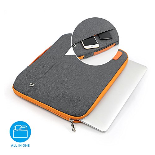 FRONT POCKET STORAGE & SMOOTHLY ZIPPER Extra pocket, enough space to keeping mouse, cable, document, cellphone, memory cards, external hard drive, pens etc. Top-loading zipper on the sleeve glides smoothly and allows convenient access to your laptop.