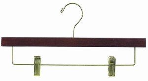 -. Feature : 14" Length with Adjustable Pant/Skirt Clips / Walnut Color with Brass Hardware / Non-Marking Soft Rubber Cushions inside Clips Protect Garments / Swivel Hook / Sold in Packs of (25) Hangers