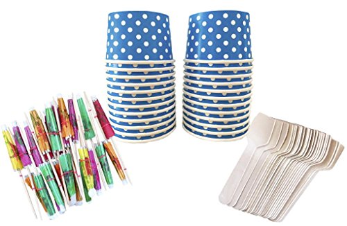 These sweet little blue and white polka dot cups each hold 4 ounces of your favorite ice cream. The sundae kit also includes 24 mini wooden taster spoons and 24 paper umbrellas to complete your sundae.
