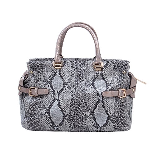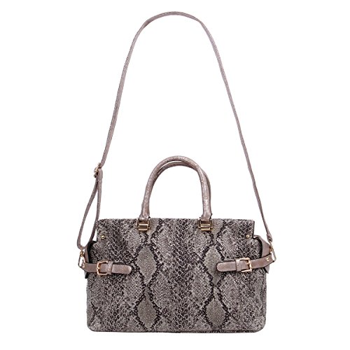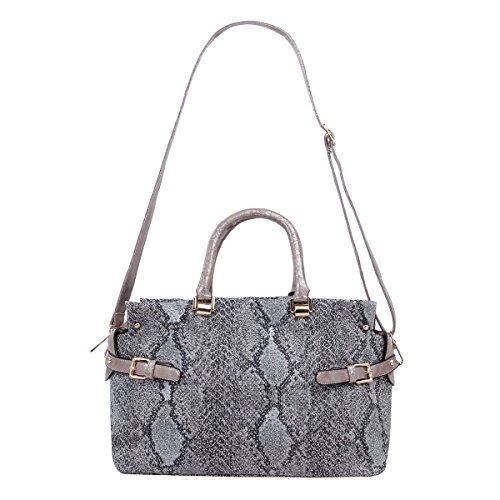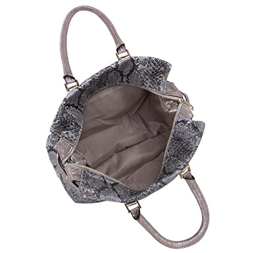 -. Feature : Premium PU leather snake skin handbag with studded front / Sturdy double handles with 5" drop. Optional removable and adjustable long shoulder strap. / Fabric lining. Top zip closure. Interior zip, wall and cell-phone pockets. / 14" (L) x 9" (H) x 6.75" (W) / Roomy and functional, luxury feel