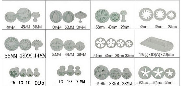 Rose: 4.6cm, 4cm, 3.4cm, 2.7cm, Carnation: 4.3cm, 3.6cm, 2.5cm, Sunflowers: 5.5cm, 4.8cm, 4.4cm, Butterflies: 4cm, 3.3cm, 2.6cm, 4cm * width 2.5cm, length 3.1cm * width 2cm, length 2.6cm * width 1.6cm, chrysanthemum: 3.3cm, 2.5cm, 1.8cm, 1.3cm, plum: 2.3cm, 1.3cm, 1.0cm, 0.95cm Two look almost the same), five-star flower: 4cm, 3.3cm, 2.13cm, small love: 1.9cm, 1.2cm, 0.9cm (amount of apical to the top of the recess), small pentagram: 1.7cm, 1.4cm, 0.8 cm