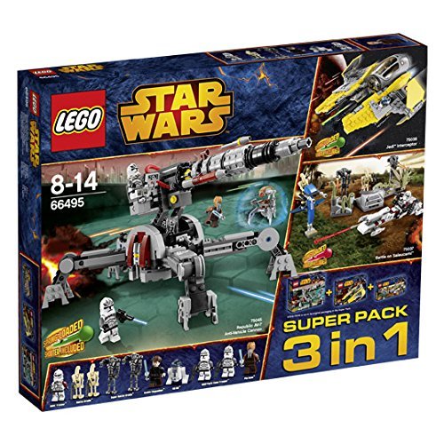 -. Feature : Lego 66495 Star Wars Super Pack 3 in 1 bestehend aus: 75038 Jedi Interceptor, 75037 Battle on Saleucami, 75045 Republic AV-7 Anti-Vehicle Cannon / Alter: 8 - 14 Jahre