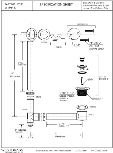 Westbrass D321-07 14-Inch 17 Gauge Brass Twist & Close Bath Drain with 2-Hole
