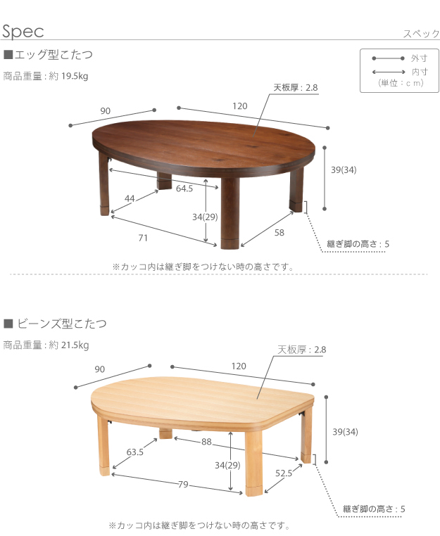 ●サイズ:エッグ型-幅120x奥行90x高さ39cm(34+継ぎ脚5cm)・約19.5kg、ビーンズ型-幅120x奥行90x高さ39cm(34+継ぎ脚5cm)・約21.5kg