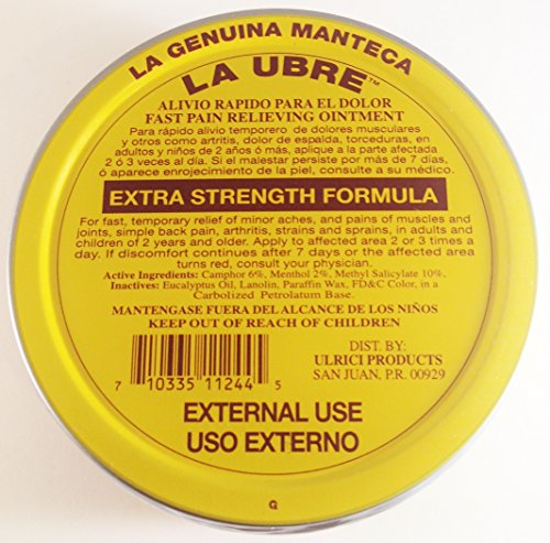 -. Binding : Health and Beauty -. EAN : 0795999900058 -. Feature : Alivio Rapido Para el Dolor / Fast Pain Relieving Ointment / Extra Strenth Formula / La Genuina de Eneglotaria -. Label : Ulrici Products -. Manufacturer : Ulrici Products -. ProductGroup : Health and Beauty -. ProductTypeName : HEALTH_PERSONAL_CARE -. Publisher : Ulrici Products -. Studio : Ulrici Products -. Title : La Genuina Manteca Ubre Tin/Lata 3 Oz. (90g.) Extra Strength Formula -. UPC : 795999900058