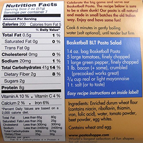 -. Binding : Misc. -. Brand : Pastabilities -. EAN : 0731244967667 -. Feature : Each package has a combination of unique pasta shapes - Basketballs and Whistles Shapes / Two natural colors made with all natural vegetable powders / 2 - 14 ounce packages. 6-8 Servings per package / Basketball BLT Pasta Salad Recipe included on back of package / Contains Wheat and Egg -. Label : The Pasta Shoppe -. Manufacturer : The Pasta Shoppe -. MPN : 7013731 -. PackageQuantity : 2 -. PartNumber : 7013731 -. ProductGroup : Grocery -. ProductTypeName : GROCERY -. Publisher : The Pasta Shoppe -. Studio : The Pasta Shoppe -. Title : Basketball and Whistles Shaped Pasta - 2 Pack -. UPC : 731244967667