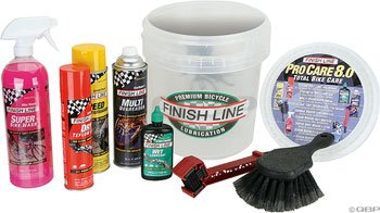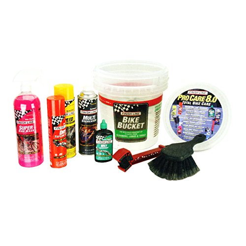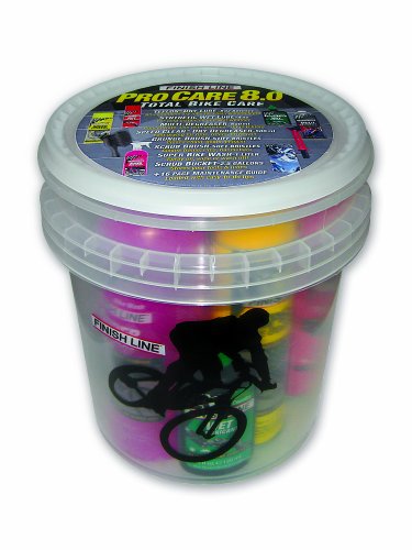 Studio : Finish Line ReleaseDate : 2009-06-12 Publisher : Finish Line Binding : Sports Product Description Total Bicycle Care in a convenient carry / storage scrub bucket!. The Pro Care Bucket Kit 8.0 includes eight items! It's everything you'll need for the total care of your bicycle. Nothing is more fun than a fresh, clean, lubed bike - you'll ride faster, smoother and longer when you use the included items to care for your bike. Includes both WET and DRY lubes in larger sizes so you're set for all weather conditions. No mater if you plan to ride in wet weather or dry dusty environments - the lube you'll need is included in this kit. An of course you'll find a bottle of Bike Wash included so you can keep your bike looking fresh and new. There's a can of Speed Degreaser for quick and easy on-the-bike cleaning of drivetrain parts. There's both a Grunge Brush and a large Scrub Brush for really getting into all the areas of your bike when it comes time to give it a serious bath. And of course a water tight Scrub Bucket to hold your soapy water while you clean and a great storage place for all your bicycle care stuff while you're out riding. Also included is a Bicycle Maintenance Guide to give you the tips and instruction you'll need on what to do, how to do and when to do it. The Pro Care Bucket Kit 8.0 sets you up all the best items for excellent bicycle care. It is our 'Total bicycle Care' selection - a great gift item for the avid cyclist. 0