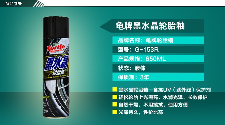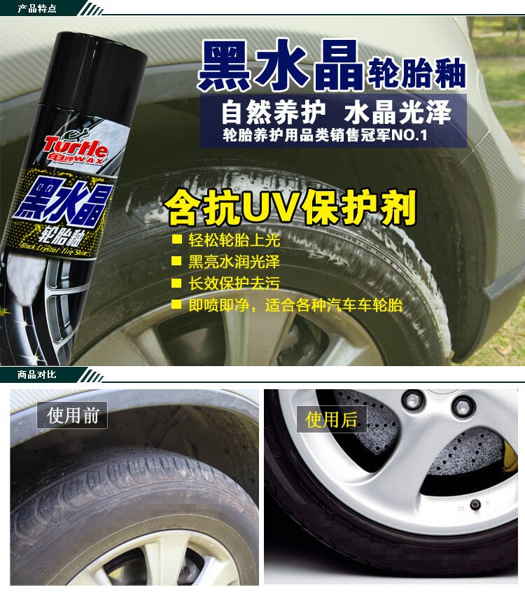 The black crystal tire glaze containing anti UV (ultraviolet) protective agent. (1) easily tire polish; (2) black water embellish luster; (3) long-term protection