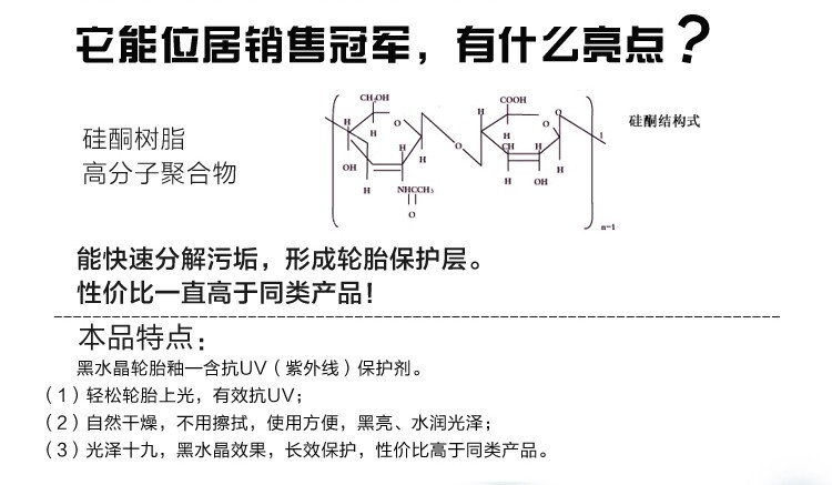 1) liquid tyre protection glaze can be used for tire rubber bumper rubber sealing stripand other objects; (2) silicon containing Tong resin polymer once sprayed on the tire the tire can give a long "crystal" gloss and protection film immediately; (3) crystal tire protection agent not to tire oil greasy feeling the product does not contain any water; (4)containing two methyl silicone and a fluorine containing special polymer can respectivelyproducts high gloss and lasting "crystal" effect -- water embellish black; (5) product contains special anti ultraviolet component and special solvent, which can increase thepermeability of the functions of the product and ensure uniform mixed product.