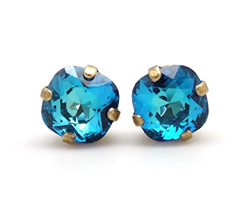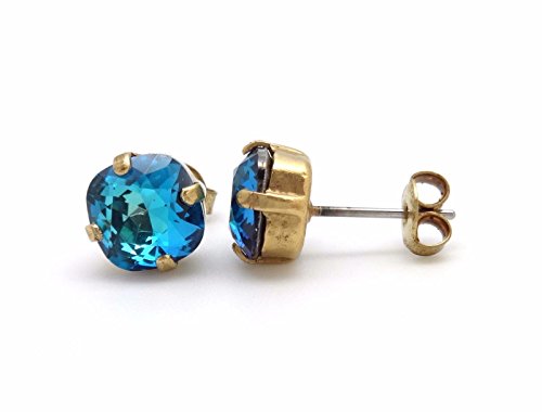 -. Feature : Gold Plating over Copper base / Beautiful 8mm Cushion cut Swarovski Crystals in Bermuda Blue / Approximately 5/16" wide / Stud Post with Butterfly Backing / Handmade