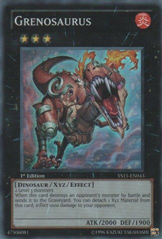 -. Brand : Yu-Gi-Oh! -. EAN : 0742359577351 -. Edition : 1st -. Feature : A single individual card from the Yu-Gi-Oh! trading and collectible card game (TCG/CCG). / This is of Super Rare rarity. / From the Starter Deck: Dawn of the Xyz set. / You will receive the 1st Edition version of this card. -. IsAdultProduct : 0 -. ItemPartNumber : YS11-EN043 -. Label : Konami -. Manufacturer : Konami -. MPN : na -. PackageQuantity : 1 -. PartNumber : na -. ProductGroup : Toy -. ProductTypeName : COLLECTIBLE_CARD -. Publisher : Konami -. Studio : Konami -. Title : Yu-Gi-Oh! - Grenosaurus (YS11-EN043) - Starter Deck: Dawn of the Xyz - 1st Edition - Super Rare -. UPC : 742359577351