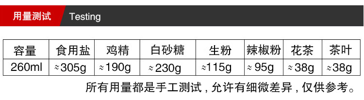 【用途】存放厨房调味料,食用盐、白沙糖、鸡精、辣椒粉、生粉等
