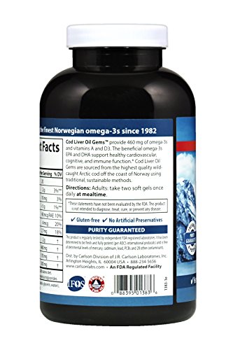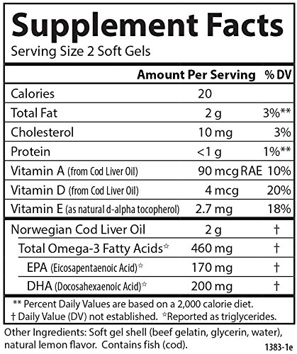 Each serving of Cod Liver Oil Gems provides 460 mg of omega-3s, which support heart, brain, vision, and joint health. This special formulation also has a delicious lightly lemon flavor, so soft gels can be chewed or swallowed. To ensure maximum freshness, Cod Liver Oil Gems are closely managed from sea to store. We source the highest quality, deep, cold water fish off the coast of Norway using traditional, sustainable methods. The same day they're caught, our fish are transported to a highly regulated Norwegian facility for processing purification. Our Cod Liver Oil is encapsulated, while the rest of the fish is used for human and animal consumption, so no part of the fish is wasted.Feature