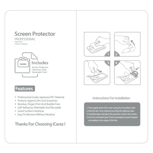 - Title : iCarez® Highest Quality Premium Screen protector for Samsung Galaxy S4 Screen Protector **PET Film Made in Japan** Easy install with Lifetime Replacement Warranty [3-Pack] - Retail Packaging 2013