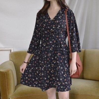 봄바람 플라워 랩원피스 화사한 컬러감의 플라워 패턴으로 랩스타일의 브이넥 라인으로 쇄골과 목선이 시원하게 드러나 바디를 여리여리하게 돋보여주는 디자인이에요 넓은 허리단 처리로 웨스트라인을 슬림하게 강조하고 가볍게 잡아준 다트에 자연스러운 플레어 라인으로 걸리쉬한 매력을 느끼실 수 있어요 또한 날개옷 처럼 넓은 소매라인 플레어 지는 디자인으로 여성스러움이 부각되어 여심은 물론 남심까지 사로잡을 수 있는 아이템이에요 뒷 지퍼 클로징으로 탈 착용이 간편하며 매끈하고 실키한 소재감으로 착용감이 좋고 안감이 없어 가볍기 때문에 더욱 편안하게 즐기실 수 있어요 / navy