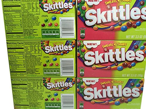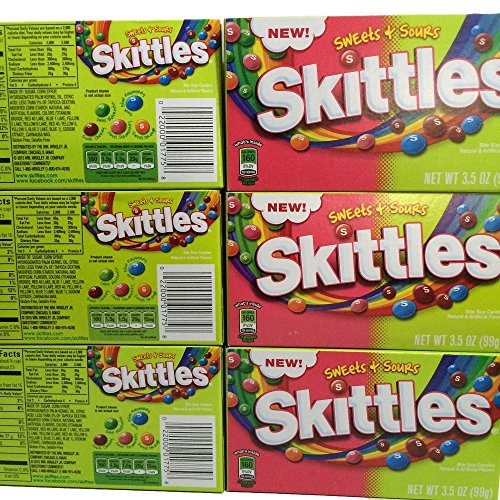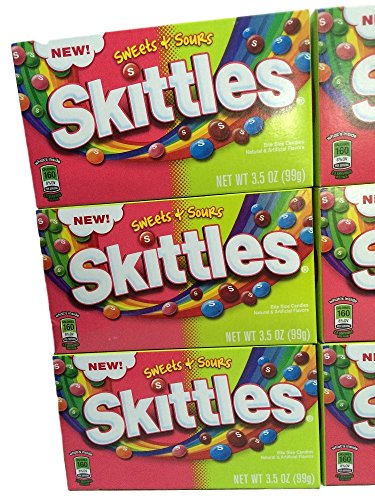 -. Feature : Bite-size, colorful chewy candies. / Sweets & Sours include sour cherry, sour blue raspberry, sour watermelon, sweet orange, and sweet strawberry flavors. / Perfect for topping for your favorite dessert. / Use these bright, bold Skittles candies as decorations. / Package includes 6 individual packs, 3.5 ounces each.