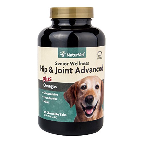 NaturVet Senior Wellness Hip & Joint Advanced Plus Omegas Formulated for Senior Dogs Provides Extra Support Needed for Healthy Aging and Advanced Hip and Joint Stages. Omegas Blended with Antioxidants Help Support the Structural Integrity of Joints and Connective Tissues. Helps Alleviate Aches and Discomfort Associated with Daily Exercise. Time Release, Chewable Tablets 90ct for Senior Dogs. Recommended to Increase Suggested Daily Amount for the First 3 Weeks, After Initial Three Week Period, Tablets can be Reduced to a Level that Maintains the Pet. Reduction Should be Done Gradually in 1/2 to 1 Tablet Increments Depending on the Weight of the Pet and Should Not be Reduced More than One Time per Month. Administration may be Increased at any Time Depending on the Pet's Needs. Active Ingredients per 5.25 gram tablet: Glucosamine, Methylsulfonylmethane (MSM), Bromelain, Egg Powder, Chondroitin Sulfate, Calcium Ascorbate, Alfalfa, Yucca schidigera, Linolenic (Omega-3), Zinc, Hyaluronic Acid, Manganese, DL-alpha-tocopheryl acetate (Vitamin E), alpha-Amylase, Lipase, Cellulase, Protease (Papaya) and Probiotics (Bacillus coagulans). All NaturVet Products are Veterinarian Formulated and Manufactured in the USA in an FDA Audited, cGMP Compliant Facility with a 100% Satisfaction Guarantee.Feature