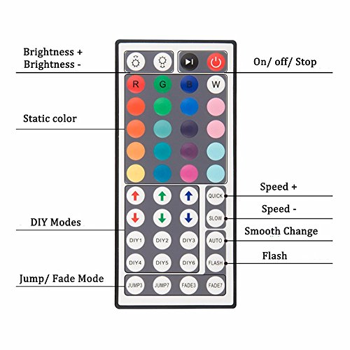 - Connection mode: Common Anode( ) - Input/Output: 12V - Max load current: 2A each color - Output: three CMOS drain-open output - Working Temperature: -20-60 degree - Mode Pattern: -Color:20 Colors 8 Light Pattern: Quick / Slow / Auto / Flash / 7 color fade change / 3 color fade change / 7 color jumpy change / 3 color jumpy change R / G / B increase and decrease control 6 DIY keys Please refer to English manual to get detailed operation - 44 keys infrared controller which has 6 keys(DIY keys) for momories the colors what you preferred.