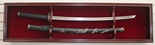 Beautifully crafted sword display case for various types of swords. Hinged acrylic door to keep dust away and protect the sword. Wall brackets affixed on the back of the display case, ready for hanging. The hinges are on the top of the display case and the latches are on the bottom. LOCKABLE DOOR to prevent inquisitive fingers. No assembly required. Fits Navy, Army, Air Force, Marine, and Samurai Sword Caution:: The interior depth is 3.7". We recommend that you measure the GUARD on the handle to make sure it is not over 3.7" so it will fit. Please measure before you buy. Dimensions: 45" L X 12" H X 4.5"D (Exterior) Weight (net): 13 lbs Inside Dimension: 44"L X 11"H X 3.7"DFeature