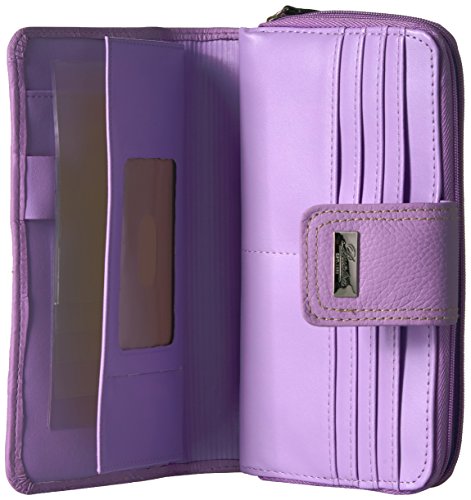 Studio : Buxton Publisher : Buxton Binding : Apparel Product Description Naturally Milled Buttersoft Leather, Contrast Stitch Detail, Shiny Nickel Hardware Westcott Organizer® Clutch features an I.D. window and multiple storage pockets, checkbook cover and multiple credit card slots. 0