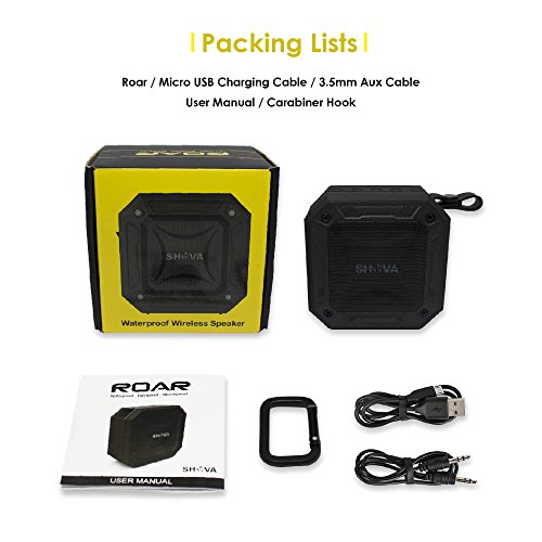 -. Feature : PITCH PERFECT AUDIO - Outdoor and Indoor Bluetooth speaker with well balance audio. It is also a great Shower speaker with 5-watt power and a passive radiator for strong bass. The high sound quality is perfect for all outdoor sports including Bicycle/Cycling, Travel, Hiking, Camping, Swimming, Running, Climbing & Fishing / WATERPROOF & DUSTPROOF - Portable Wireless Outdoor speaker is of IP67 Standard. It is totally waterproof up to 1M depth and Dust tight with no ingress of dust. Shava Roar is excellent as Shower speaker and Outdoor use even at the beach / BATTERY POWER - Bluetooth Shower speaker has 1800mAh battery pack for 19 hours of audio streaming. It is therefore a suitable Outdoor speaker for music playing the whole day. Micro USB cable is provided for full charge in 3 hrs / UNIVERSAL COMPATIBILITY - Portable speakers can be paired with all types of devices that use Bluetooth technology! Use the Waterproof and Dustproof Bluetooth V4.2 speaker to stream music from any iPhone or Android smartphone, an iPad or Android tablet, an iPod Touch or even a computer or laptop with Bluetooth / EASY TO PAIR - Bluetooth Shower speaker & Outdoor speaker uses Bluetooth 4.2 technology. It pairs with portable devices much quicker than other portable Bluetooth speakers. The wireless outdoor and shower speaker range is 33 feet, so you can listen to your device from a distance. There is also in-built microphone on this portable wireless speaker for handsfree calls