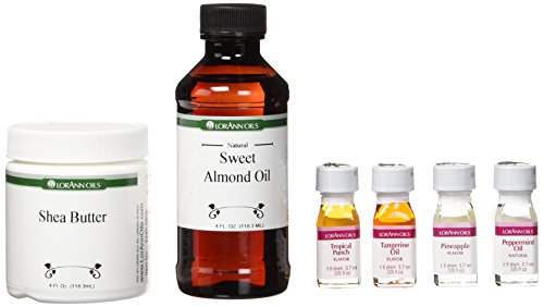LORANN OILS-Premium Lip Balm Kit. Make your own lip balm with this fun kit. This 11x11-1/2 inch package contains four ounces of almond sweet oil; four ounces of shea butter; beeswax beads; twelve clear pots with caps; twelve plastic tubes with caps; one dram tangerine flavoring; one dram peppermint flavoring; one dram pineapple flavoring; one dram tropical punch flavoring; six stir sticks; twenty-four labels and instructions. Made in USA.Feature