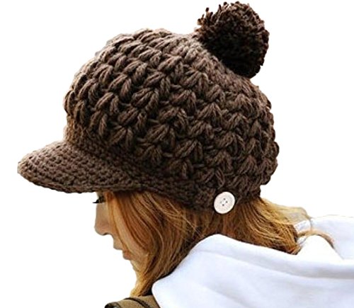 -. Title : ニット帽 レディース つば付 ぽんぽん ボタン付 ニット帽 ざっくり編み (ブラウン)