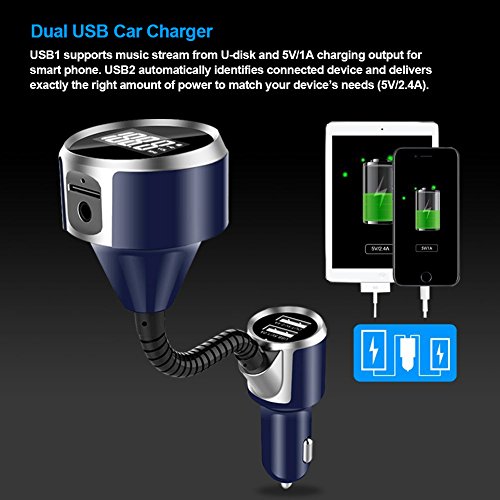 [DUAL USB CAR CHARGER]: USB1 supports music stream from U-disk and 5V/1A charging output for smart phone. USB2 (5V/2.4A) automatically identifies connected device and its unique charging requirement then delivers exactly the right amount of power to match your device's needs. Multi-Protect safety system and premium grade circuitry ensures complete protection for you and your device