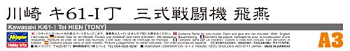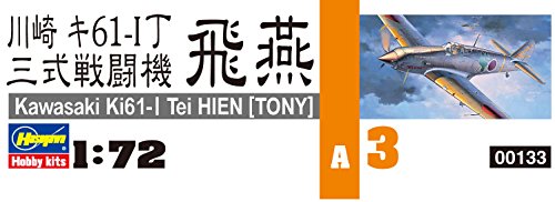 Studio : Hasegawa Publisher : Hasegawa Binding : Toy Product Description The Kawasaki Ki-61 Tei Hein name roughly translates into flying swallow, but the Allies used Tony as its code name. Used by the Imperial Japanese Army Air Force in World War II, this single-engine, land-based tactical fighter carried the army designation Army Type 3 Fighter. The prototype of the San-shiki-Sentohki ichi gata (Type 3 Fighter, Model 1, the official IJAAF designation) first flew in December 1941. Over 2,500 Ki-61s were produced. Its combat initiation came in 1943 around New Guinea, and missions continued throughout the war ? in Southeast Asia, Okinawa, China, and as a U.S. bomber interceptor over the Japanese home islands. This was the only mass-produced Japanese WWII fighter to use a liquid-cooled inline V engine. Highly detailed model kit includes waterslide decals and illustrated instructions. Decal options included: 244th Sentai (Fighter Group) Major Kobayashi Chofu 1945; and 17th Sentai (Fighter Group) Layte 1944. Paint colors needed: White, Black, Silver, Flat Black, Steel, Orange Yellow, Flesh, Red Brown, IJA Green, IJA Gray, Burnt Iron, Tire Black, Sandy Yellow, Khaki Green, Khaki, Clear Red, and Clear Blue. 0