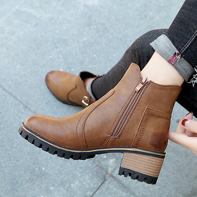 秋冬季马丁靴铆钉机车靴粗跟短靴女英伦风学生中跟裸靴女靴
