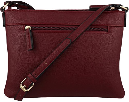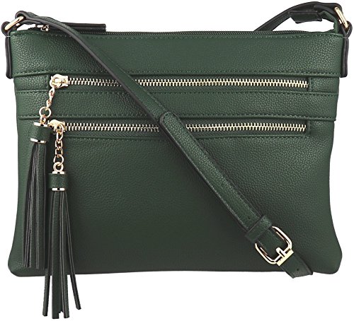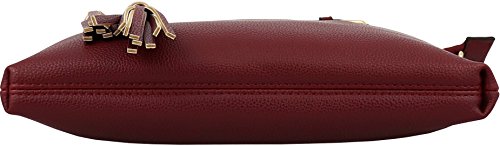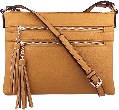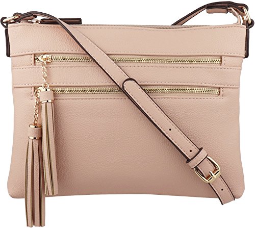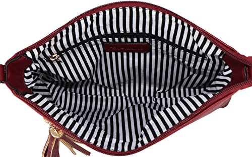 Fashion crossbody handbag that is made with faux leather with a black and white striped fabric lining. The purse is lightweight and incredibly comfortable to use on an everyday basis. It has a zipper closure at the top and two zipper pocket with a tassel accents on the front.