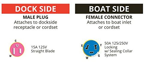 - 15a 125V straight blade dock side male plug, 50a 125/250V locking w/sealing collar System boat side female connector
