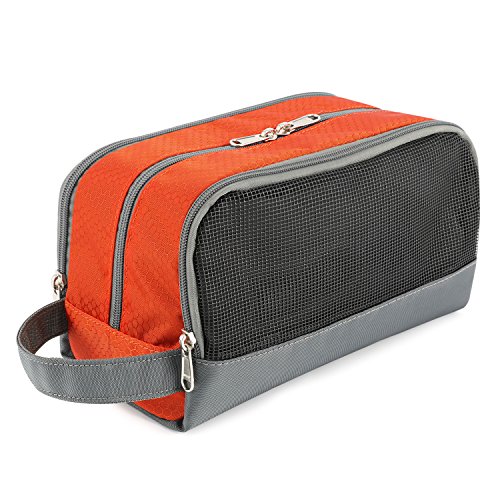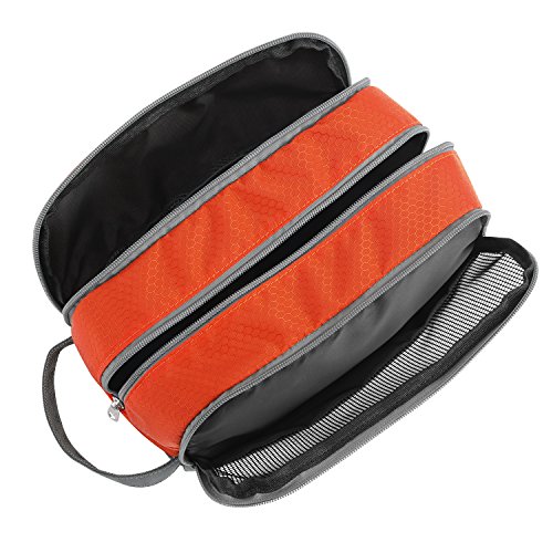 All the three compartments have zippers, the mesh pocket on one side is visible and breathable; The convenient strap on one end is perfect for hanging.
