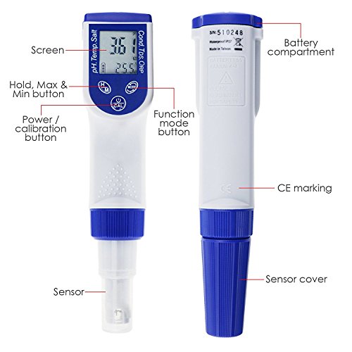 -. Feature : Range: pH (2~16pH) / Temp. (0~90°C) / ORP (-1000~1000mV) /Conductivity: 0~2000µS ; 2.00~20.00mS / TDS: 0~1300ppm; 1.30~13.00ppt / Salt: 0~1000ppm ; 1.00~12.00ppt / Parameter: pH / ORP / Conductivity / Temperature / TDS & Salinity in one pen / It Floats on water / Accuracy: pH: ±0.01pH+1dgt; Temperature ±0.2°C+1dg; ORP ±2 + 1dgt; Conductivity ±2%FS; TDS ±2%FS; Salt ±2%FS / Digital calibration by one button
