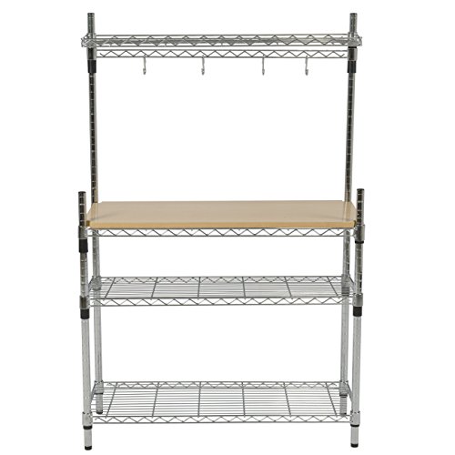 Removable wooden cutting board enables you to prepare your food, the 3 shelf levels give you more space to store food, & the 4 hooks are created to place pots/pans