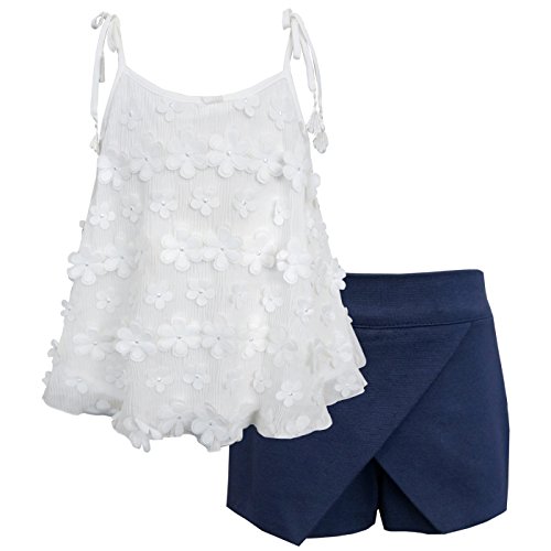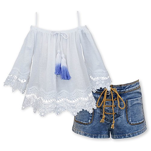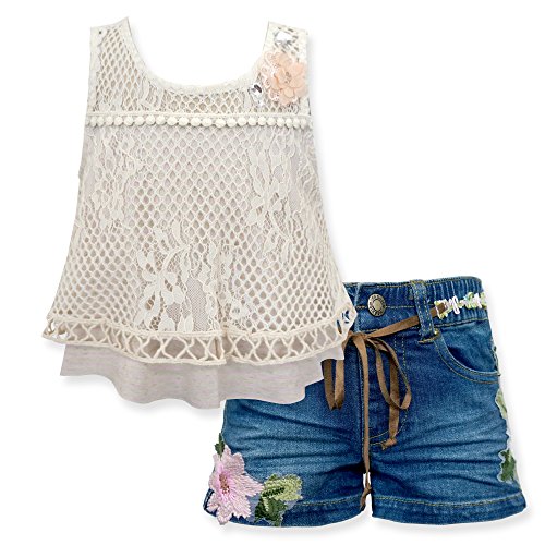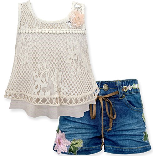 The IVORY-PINK set features a vintage-inspired tunic with gorgeous soft lace overlay & flower chiffon embellishments paired with a beautiful embroid sweet flower and faux leather belt denim shorts.