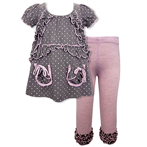 The PINK MULTI set features a charming polka dot ruffles top paired with a ruffle embellished legging.