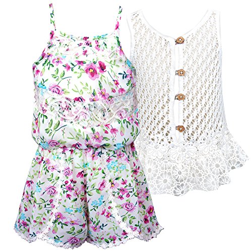 The GREEN MULTI set features a gorgeous & summer-perfect floral romper paired with a net crochet vest.