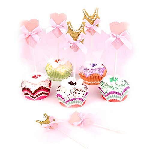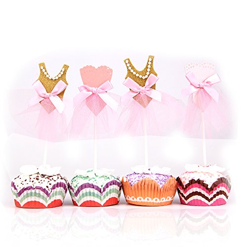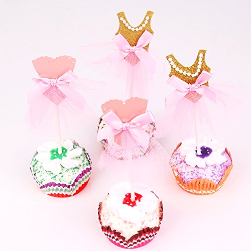 Skylove Ballerina Tutus Cupcake Toppers Ballet Princess Skirt Cake toppers Glitter Decoration for any Childrens Party, Pink/Gold (Set of 10)