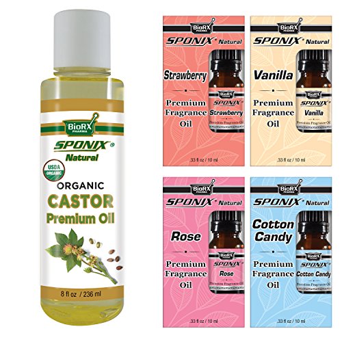 Sponix Fragrance Skincare Kit 4 - Fragrance Oils and Carrier Oil Combo - Castor Oil (8 oz), Strawberry, Vanilla, Rose & Cotton Candy (10 mL)