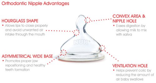 -. Feature : NUK® Orthodontic Replacement Nipples help support healthy oral development / Features unique NUK® Air System which helps to reduce colic; Natural shape nipple allows easy back and forth between breast and bottle / Drinking hole specially located on the top side of the nipple versus the tip on round bottle nipples that promotes better, easier digestion / Fits all NUK® wide neck bottles / This Includes: 2 Medium Flow (6-18 months) and 2 Fast Flow (18+ months) Nipples