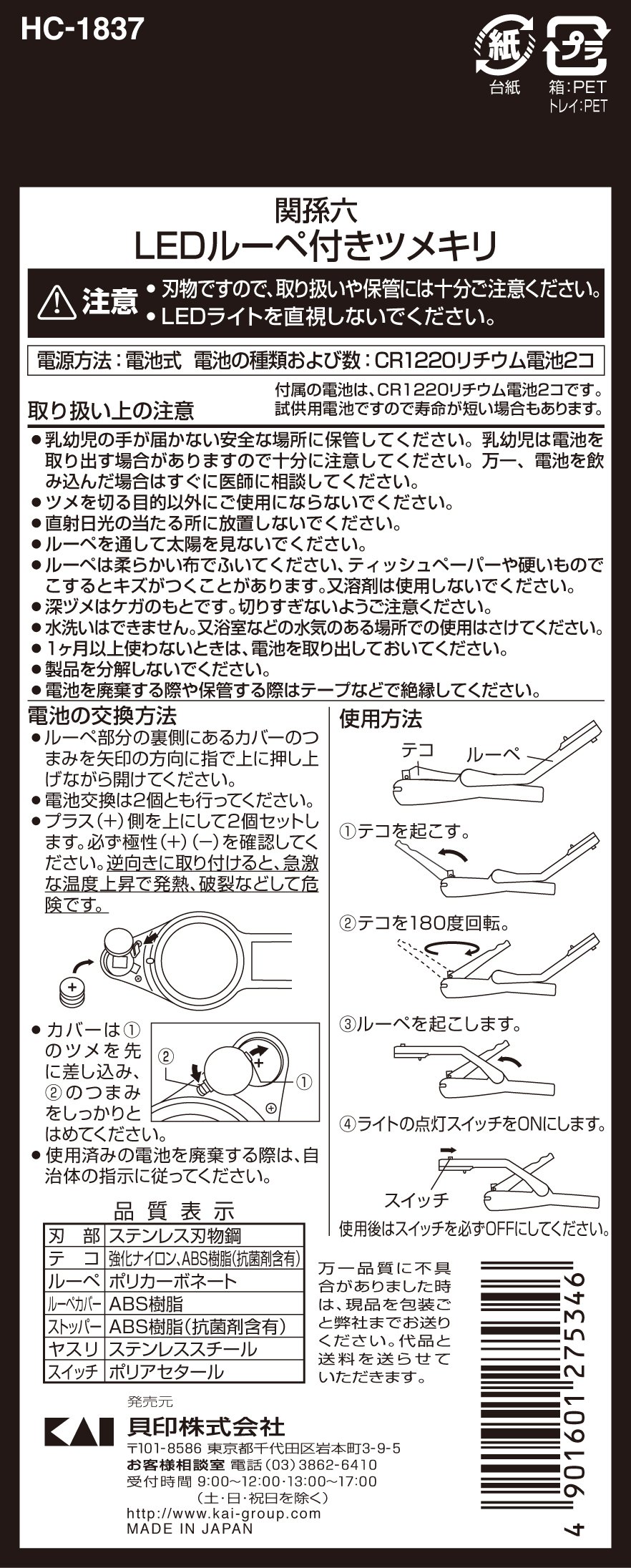 Japan Health and Personal Care - Kai Seki Magoroku LED magnifier with nail clippers HC1837 *AF27*