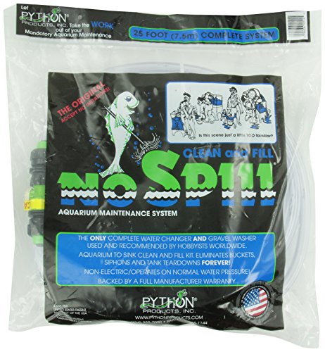 Smaller, more frequent water changes are imperative to the health of your fish. Without regular water changes, invisible toxins can build up in your aquarium creating a hazardous environment for its inhabitants. The Python No Spill Clean and Fill is a complete ready-to-use system which adapts easily to most faucets and makes water changes a breeze. It drains as well as fills aquariums, and will not disturb fish or decor during routine aquarium maintenance. No buckets, no siphons, no mess, no tank tear downs...EVER again. The Python No Spill Clean and Fill system includes: hose, gravel tube, switch, hose connectors, faucet pump, and brass faucet adapter.Feature