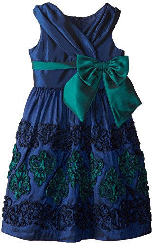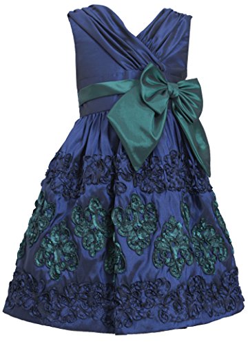 Little girl navy-blue/green taffeta special occaion, flower girl, party dress features cross over bodice, bow trim at waist and soutache details at border hem. Matching/Coordinating sister styles available in sizes 2T-16, reference style BNJ-38644H.Feature
