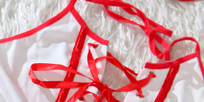 让你的宝贝儿因你而纯情与性感兼顾,前胸系带式设计,红白经典搭配,连身微露春光的小短裙,露背,吊颈式细带样式,在愉悦的今夜,让你们一起随意盎然,享受这美好的夜晚.配小帽,下身配同色系小T裤. |