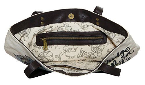 Studio : Loungefly Publisher : Loungefly Product Description Loungefly's boutique quality purse features all our favorite characters including Belle, the Beast, Mrs. Potts, Chip, Lumiere, and Cogsworth all portrayed in a beautiful sketch and watercolor print. The reverse side has Beauty and the Beast printed on it with a watercolor rose as its background. Back also has a brass and black resin metal label stamped with both Disney and Loungefly's brand logos. Main compartment has a strong magnetic snap closure and the roomy interior is lined with a canvas fabric printed with sketches of the characters. Interior offers a zipped side large pocket and an open side pocket large enough for most phones. Officially licensed by Disney. Measures 17 inches wide, 13 inches tall, and 6 inches deep. 10 inch handle drop. Made of quality faux leather and natural canvas. Vegan friendly. 0 |