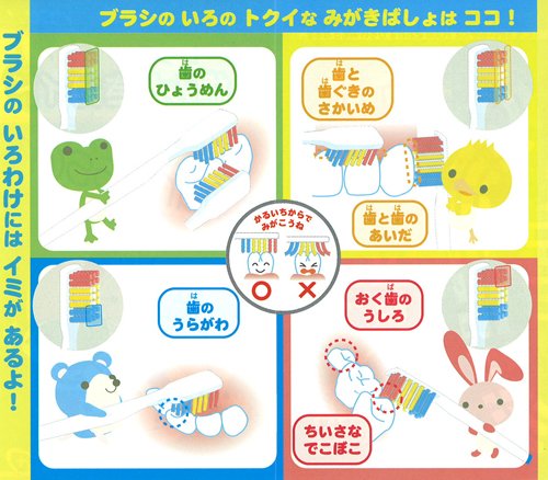 フォーレッスンは目で見て磨きやすいように、ブラシの部分を4色に色分けし、ハンドル部分を透明にした歯ブラシです。 「タイニー」「スモール」の「フォーレッスン」仕様の歯ブラシ。< br> 毛の硬さ やわらかめ< br> 親子で楽しく歯みがきできる『歯みがきガイド』付き!
