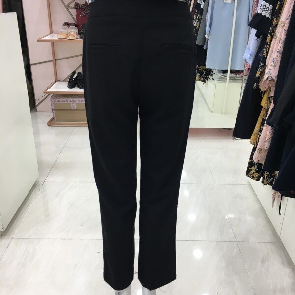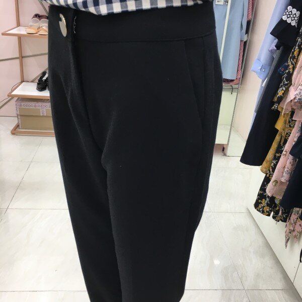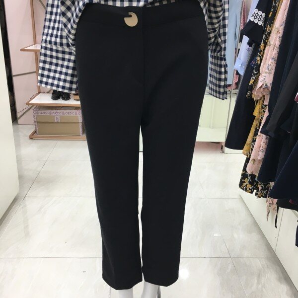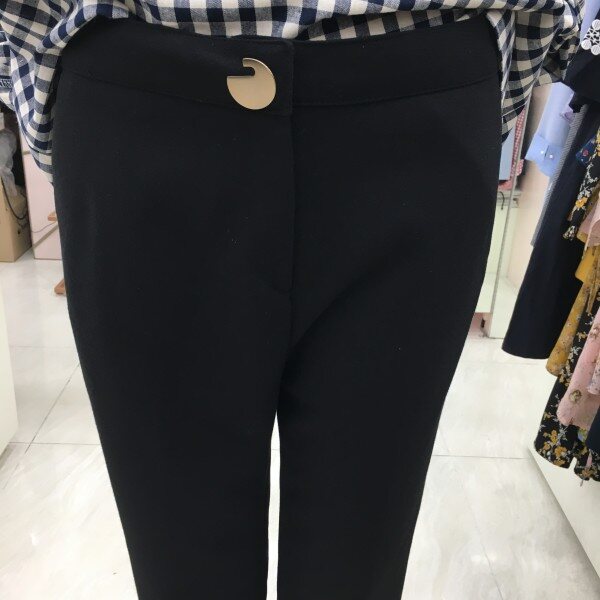 금장느낌의 단추가 포인트인 기본 슬랙스입니다. 버클이 포인트라 기본 화이트 셔츠나 니트와 매치하셨을 때 고급스러운 느낌입니다.