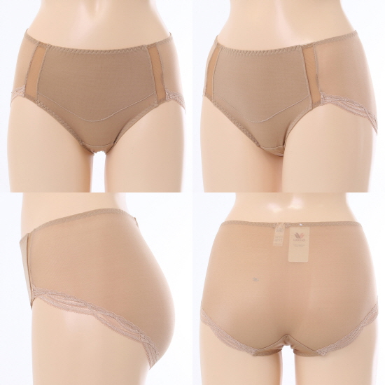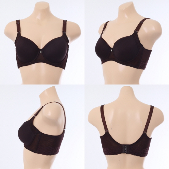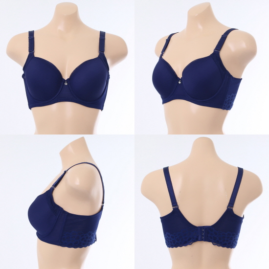 수퍼 스트레치 몰드로 제안된 보정용 제품. 몰드가 부드럽고 신축성이 있어서 가슴을 아주 편안 하게 잘 감싸고 컵 상변에 바이어스를 7mm폭으로 덧대주어 상변이 눌리지 않게 잘 커버 해 준다.또한 컵옆으로 원단을 덧대어서 컵둘레를 길게 연장 함으로써 가슴이 퍼지지 않게 푹 감싸 주고 더불어 날개폭